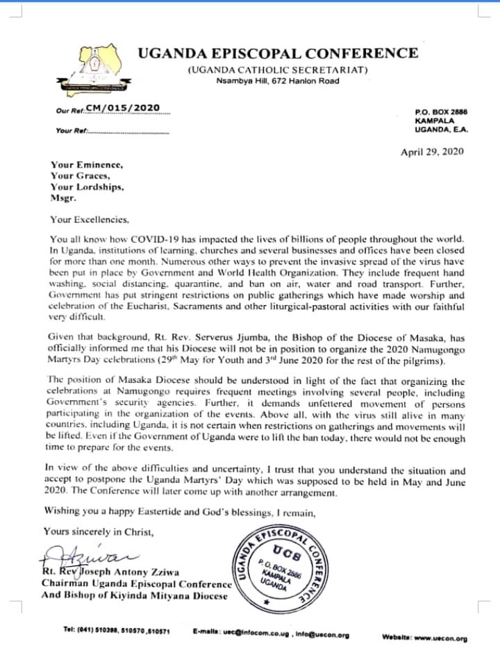 Uganda Episcopal Conference is a body that brings together Catholic Bishops in Uganda and according to the letter dated April 29, 2020, the celebrations have been postponed to a yet-to-be-confirmed date.